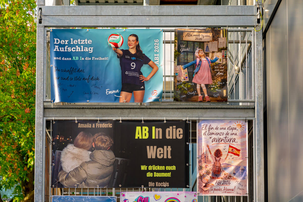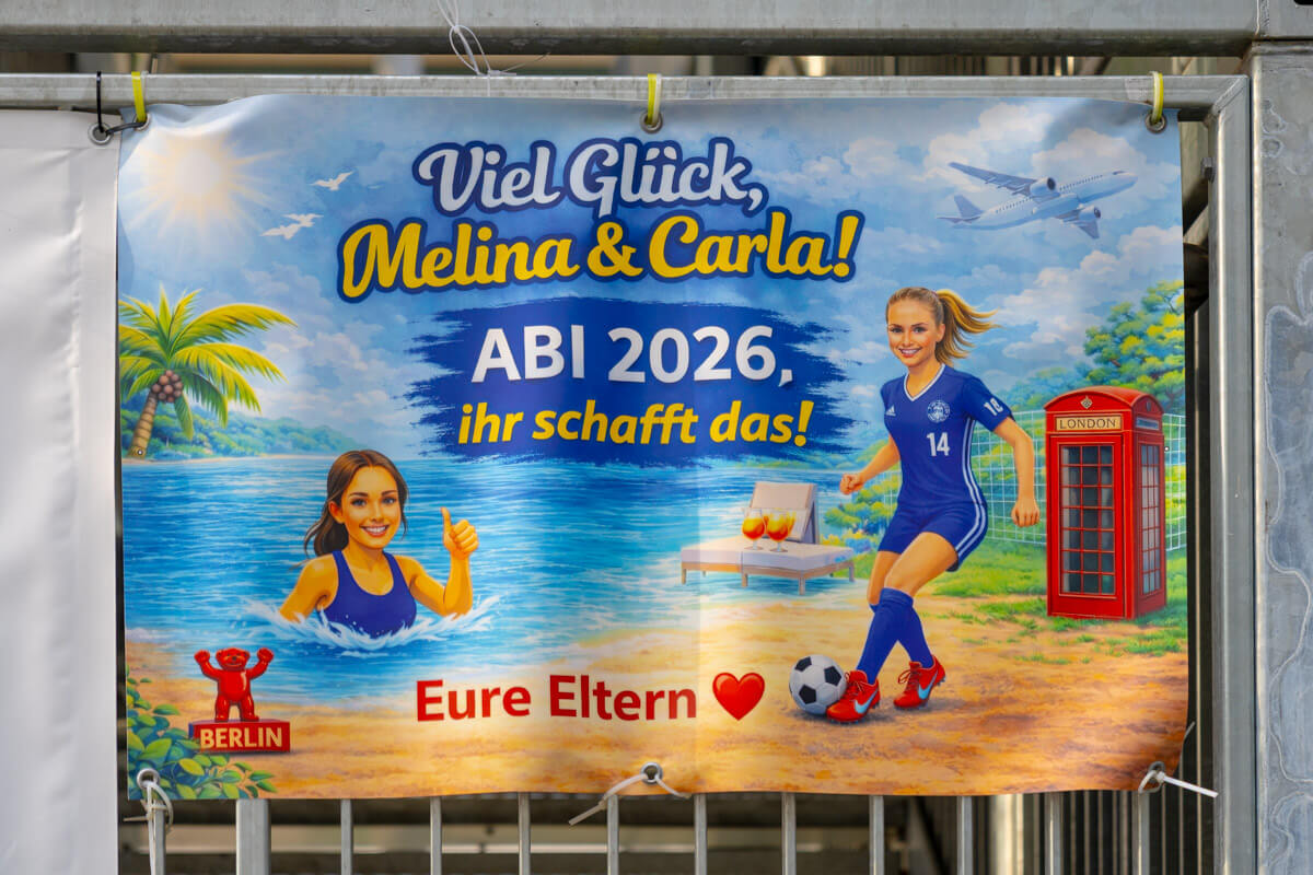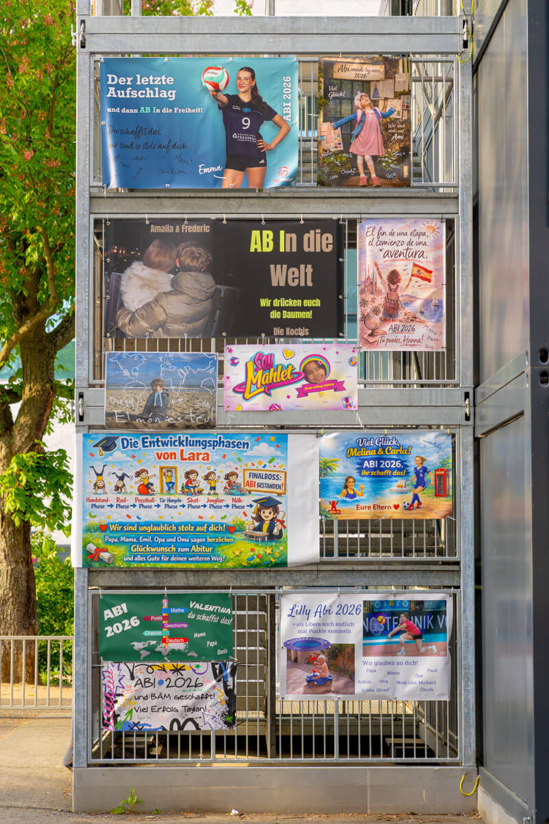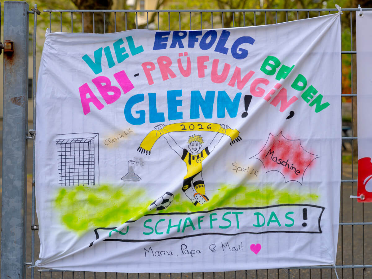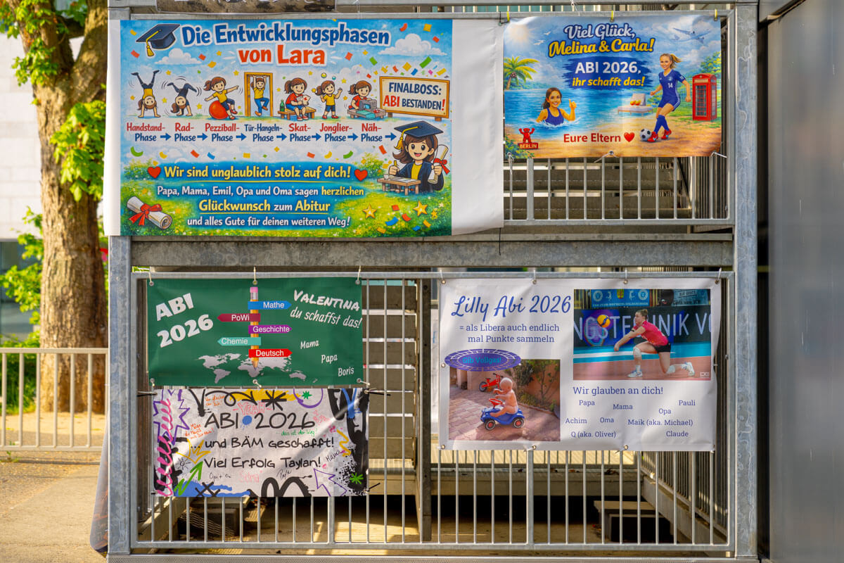 Auch in die­sem Jahr hän­gen wie­der zahl­rei­che lie­be­voll gestal­te­te Glück­wunsch­pla­ka­te an den Zäu­nen und Balus­tra­den der Schu­mann­schu­le. Sie wur­den mit viel Herz­blut, Krea­ti­vi­tät und teil­wei­se auch mit­hil­fe von KI ent­wor­fen und sol­len den Prüf­lin­gen, die sich gera­de den Abitur­prü­fun­gen stel­len, Mut, Zuver­sicht und ganz viel Glück schenken.