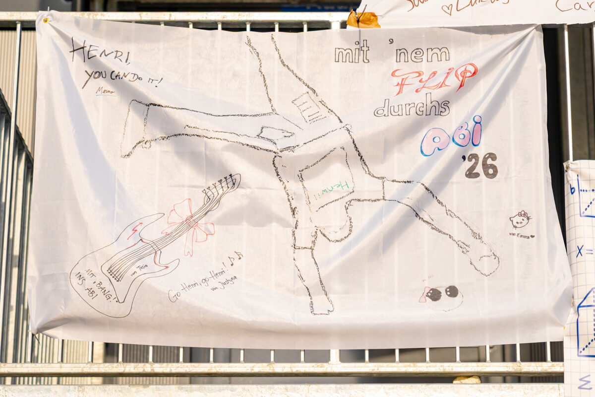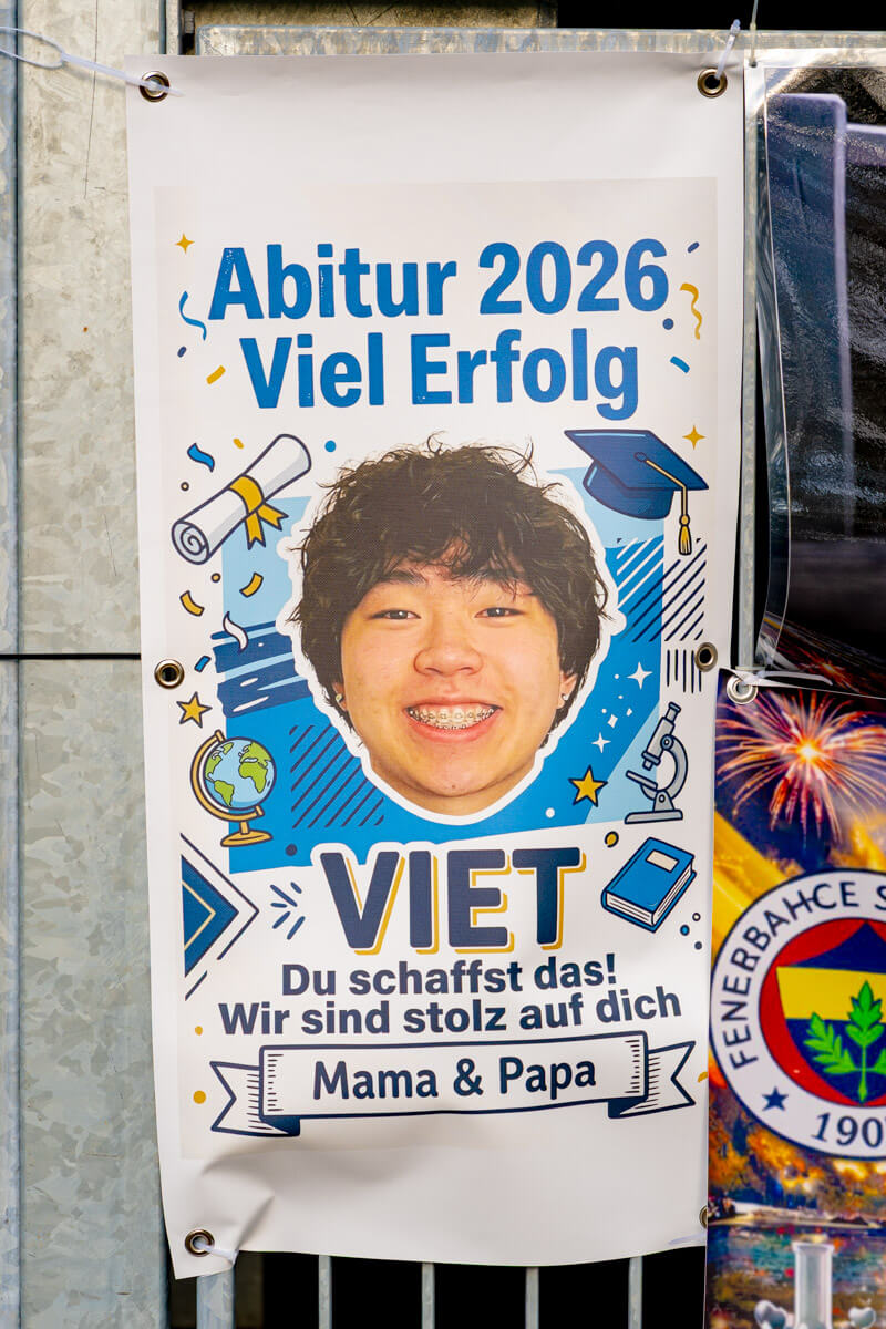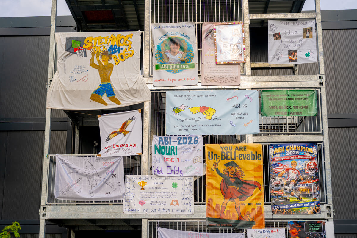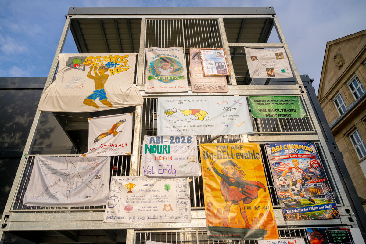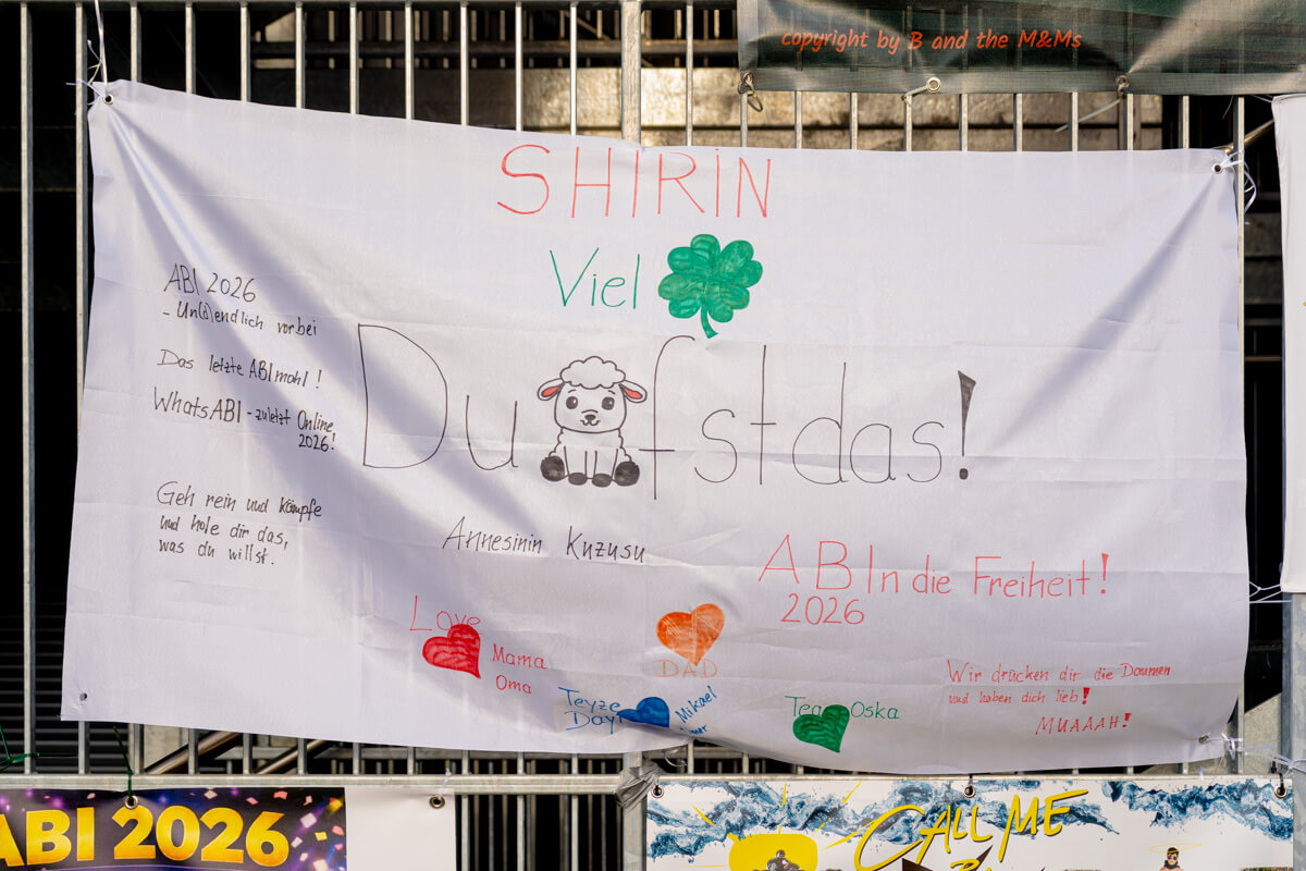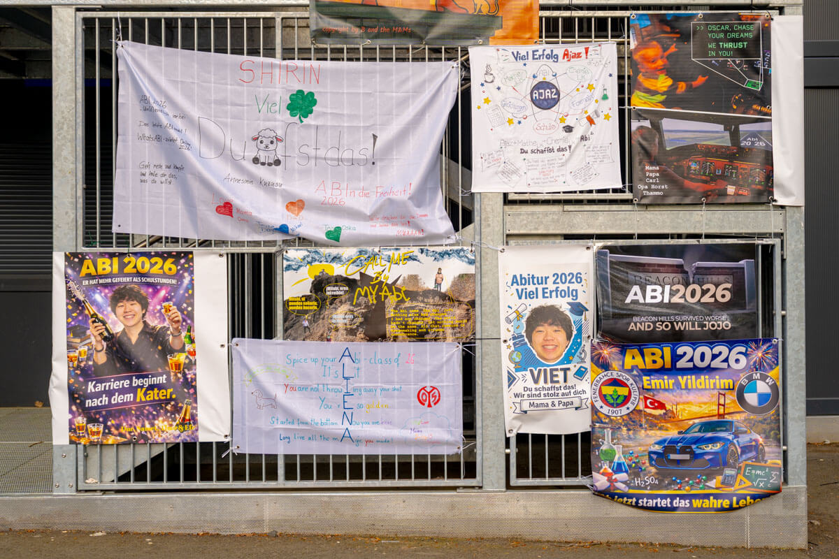 Auch in die­sem Jahr hän­gen wie­der zahl­rei­che lie­be­voll gestal­te­te Glück­wunsch­pla­ka­te an den Zäu­nen und Balus­tra­den der Schu­mann­schu­le. Sie wur­den mit viel Herz­blut, Krea­ti­vi­tät und teil­wei­se auch mit­hil­fe von KI ent­wor­fen und sol­len den Prüf­lin­gen, die sich gera­de den Abitur­prü­fun­gen stel­len, Mut, Zuver­sicht und ganz viel Glück schenken.