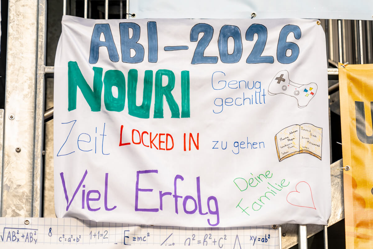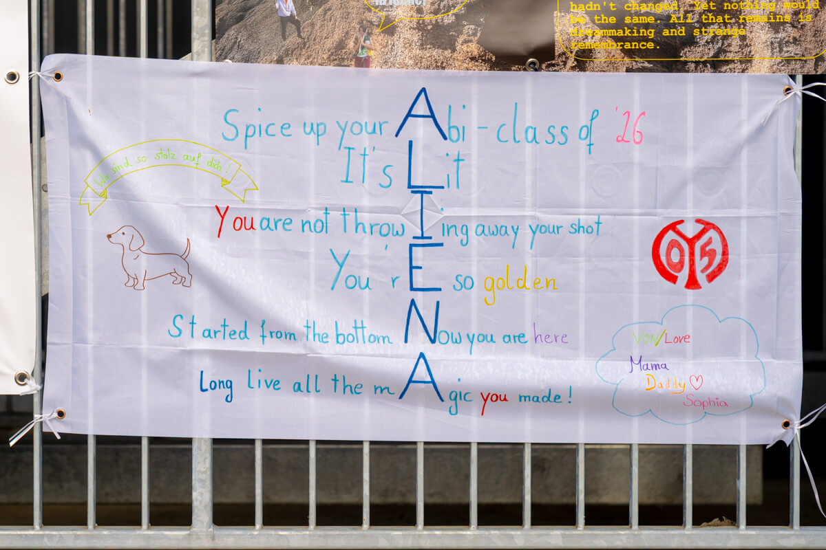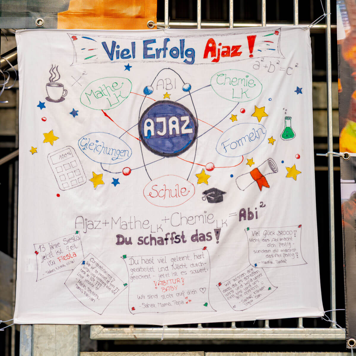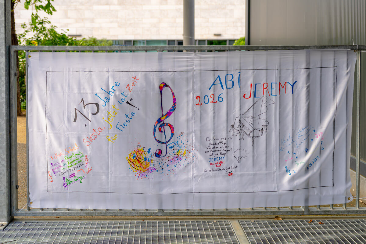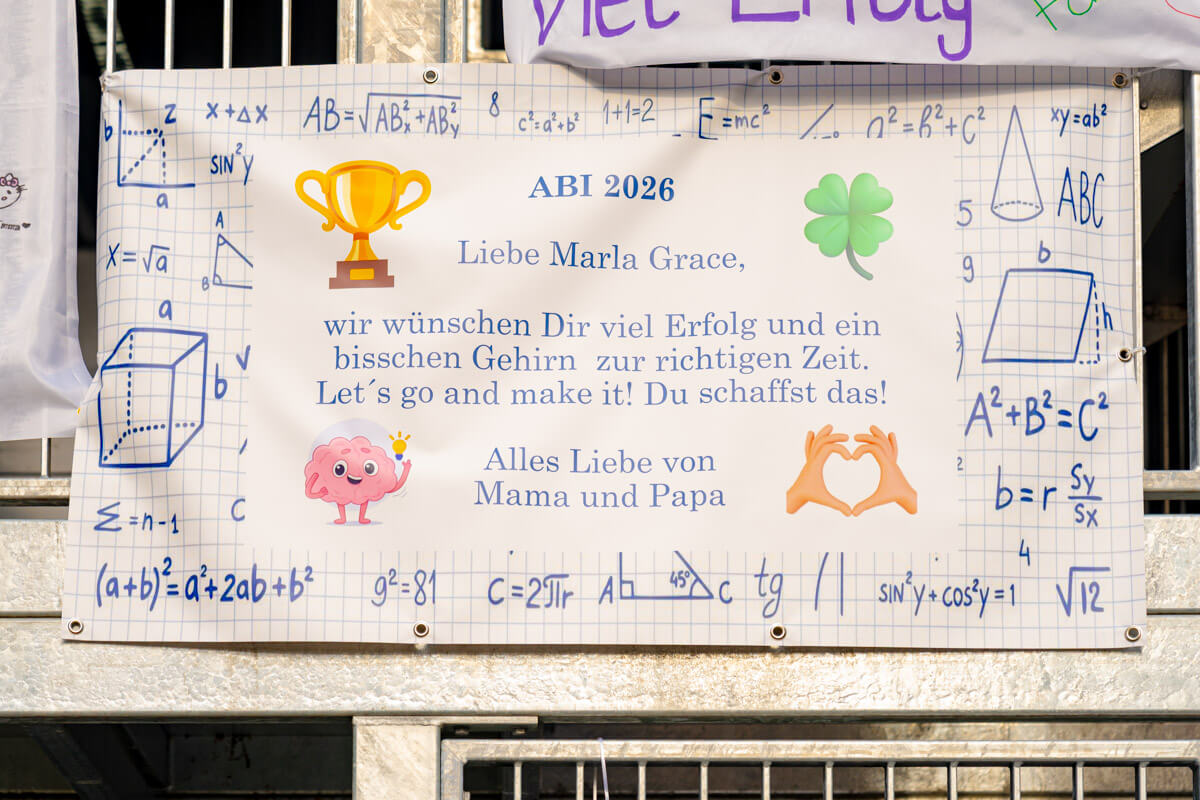 Auch in die­sem Jahr hän­gen wie­der zahl­rei­che lie­be­voll gestal­te­te Glück­wunsch­pla­ka­te an den Zäu­nen und Balus­tra­den der Schu­mann­schu­le. Sie wur­den mit viel Herz­blut, Krea­ti­vi­tät und teil­wei­se auch mit­hil­fe von KI ent­wor­fen und sol­len den Prüf­lin­gen, die sich gera­de den Abitur­prü­fun­gen stel­len, Mut, Zuver­sicht und ganz viel Glück schenken.