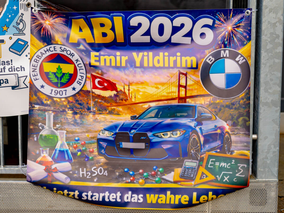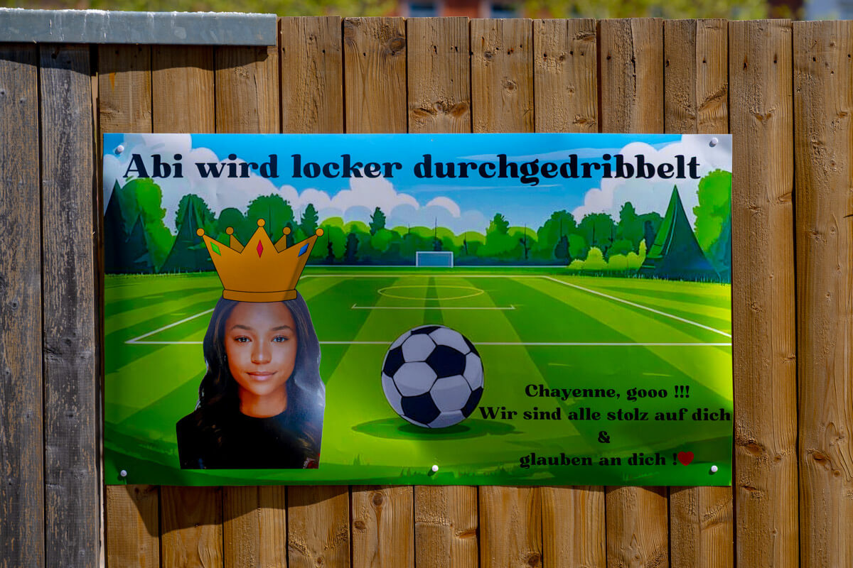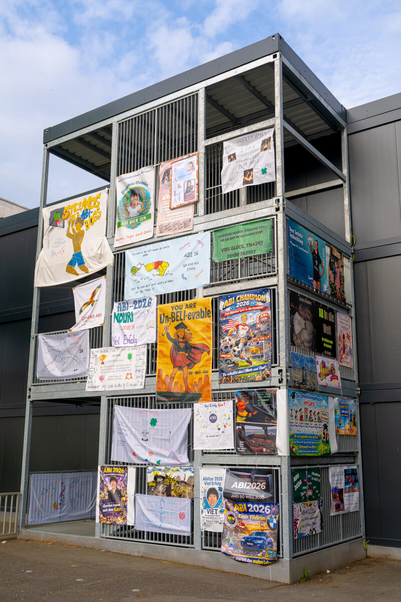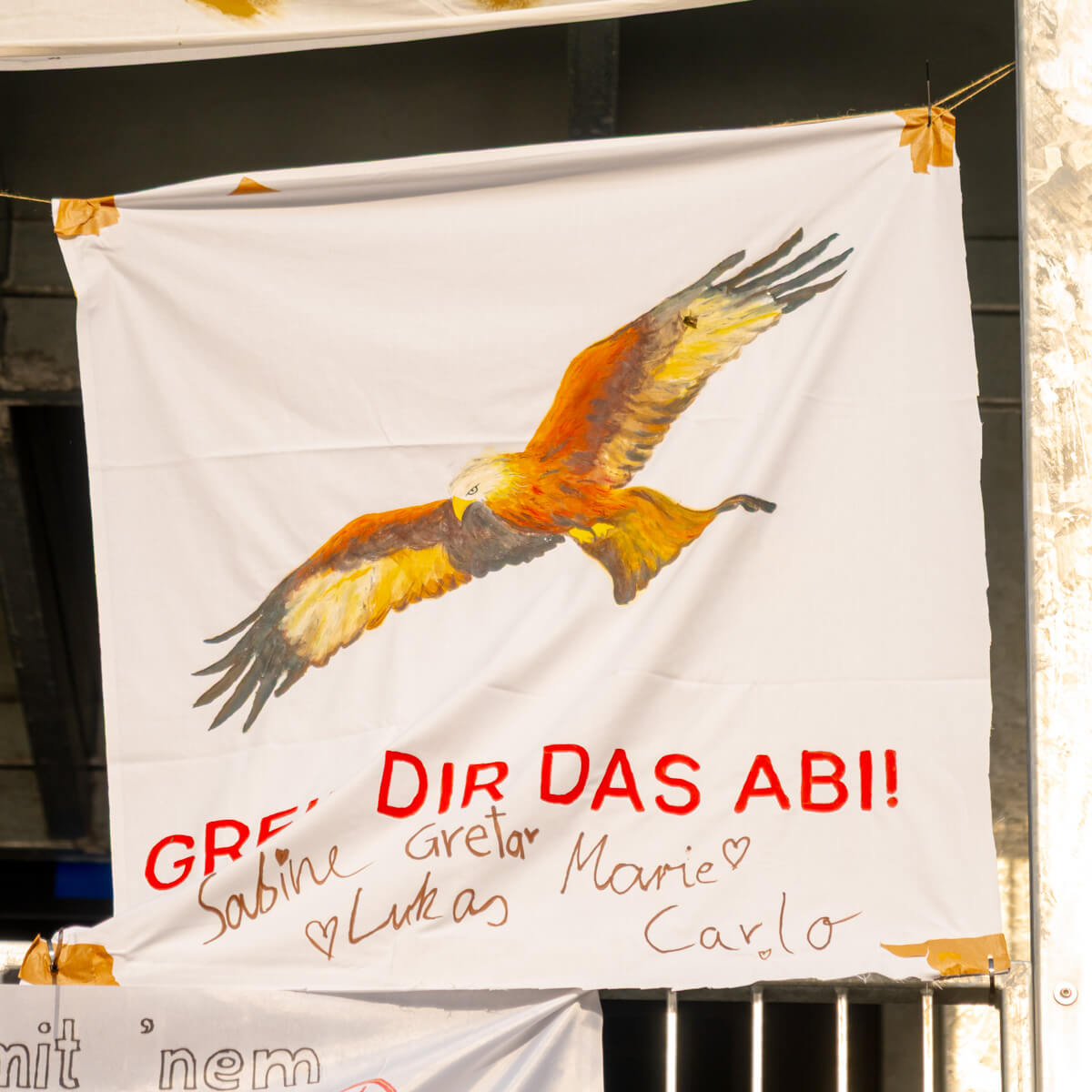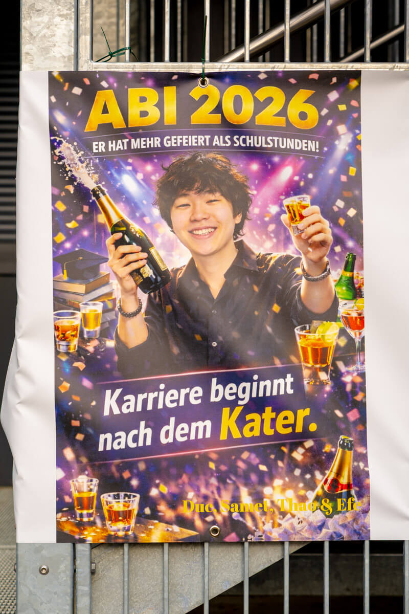Auch in die­sem Jahr hän­gen wie­der zahl­rei­che lie­be­voll gestal­te­te Glück­wunsch­pla­ka­te an den Zäu­nen und Balus­tra­den der Schu­mann­schu­le. Sie wur­den mit viel Herz­blut, Krea­ti­vi­tät und teil­wei­se auch mit­hil­fe von KI ent­wor­fen und sol­len den Prüf­lin­gen, die sich gera­de den Abitur­prü­fun­gen stel­len, Mut, Zuver­sicht und ganz viel Glück schenken.