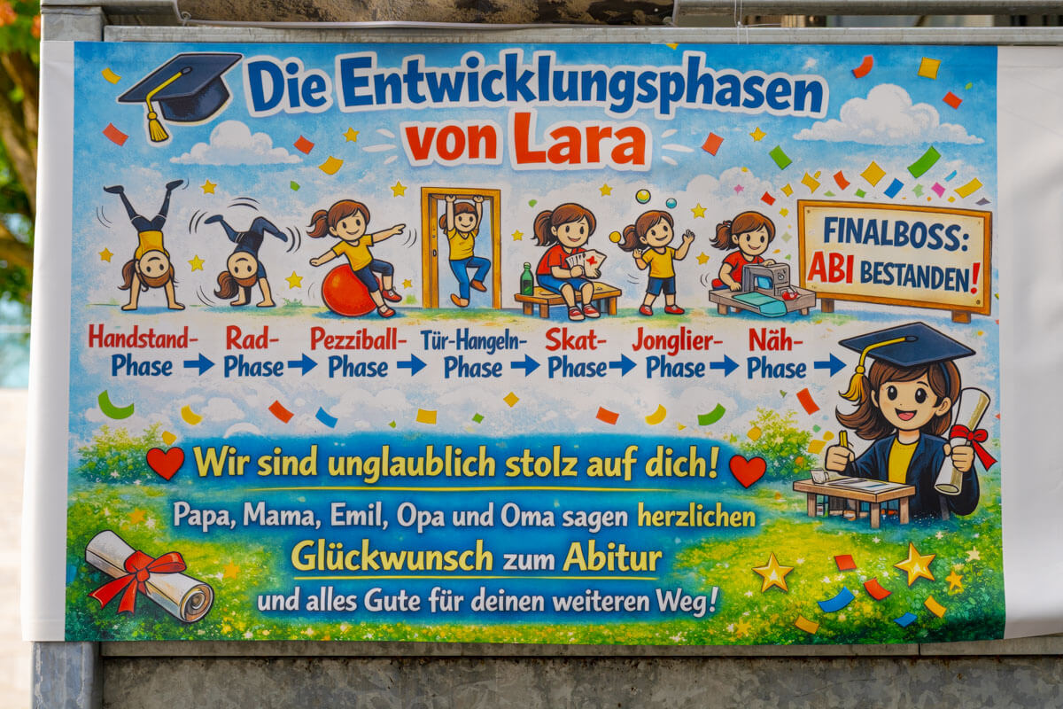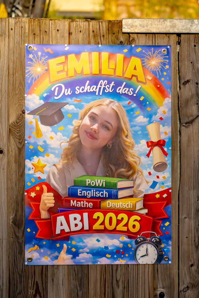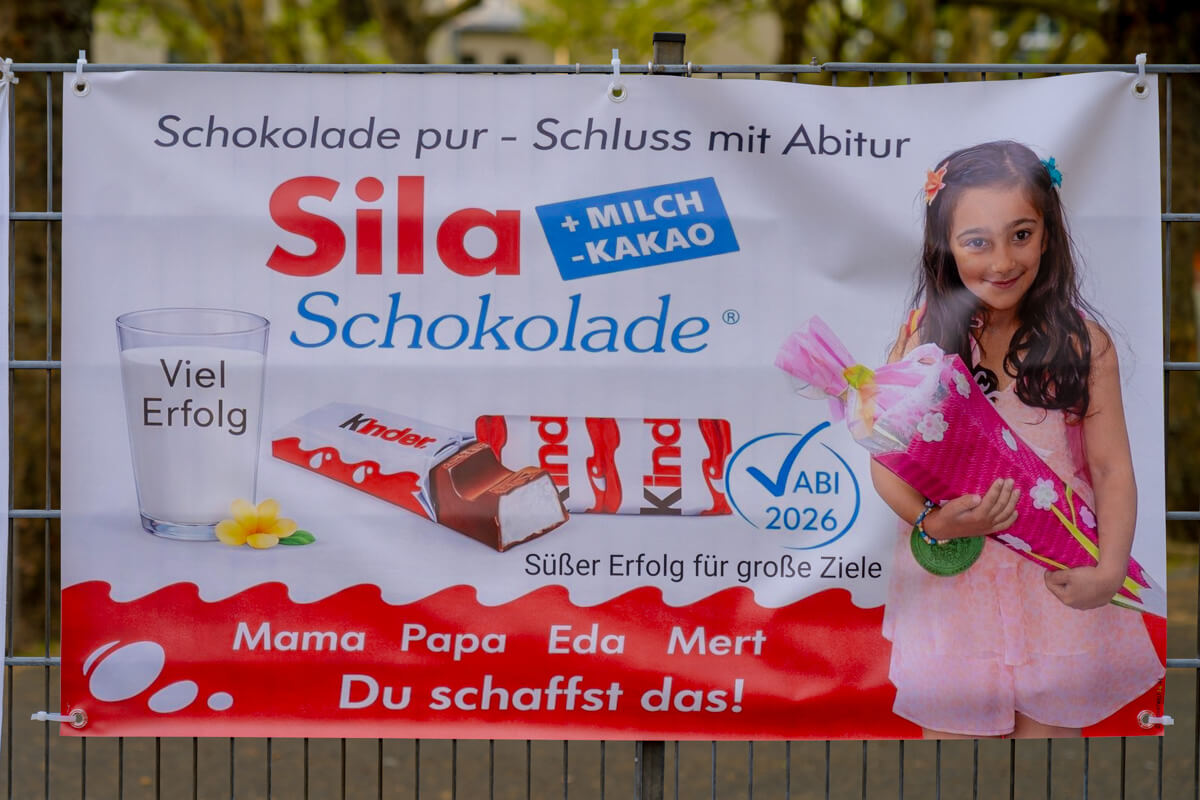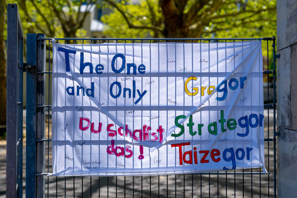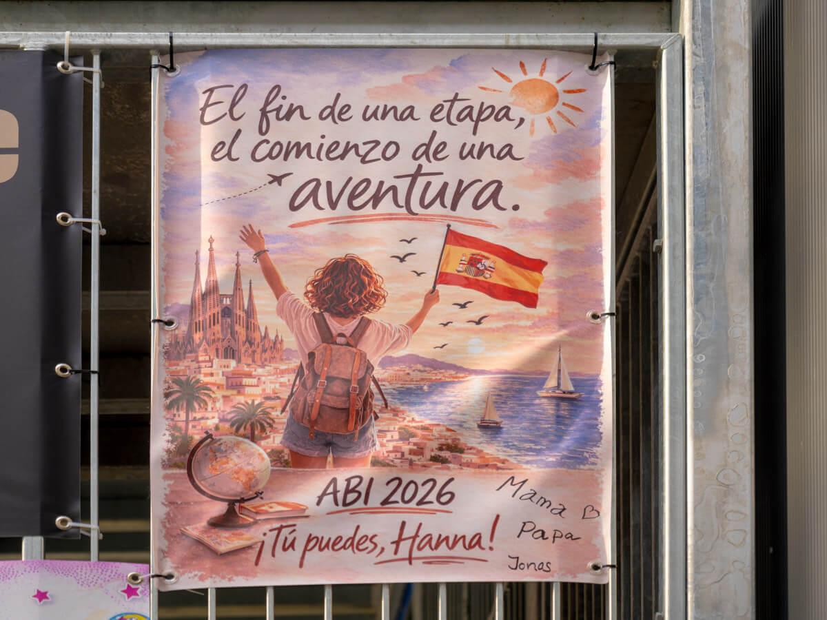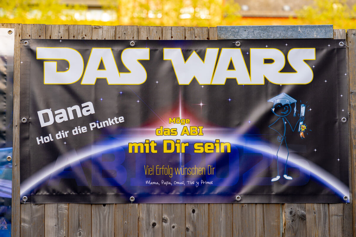 Auch in die­sem Jahr hän­gen wie­der zahl­rei­che lie­be­voll gestal­te­te Glück­wunsch­pla­ka­te an den Zäu­nen und Balus­tra­den der Schu­mann­schu­le. Sie wur­den mit viel Herz­blut, Krea­ti­vi­tät und teil­wei­se auch mit­hil­fe von KI ent­wor­fen und sol­len den Prüf­lin­gen, die sich gera­de den Abitur­prü­fun­gen stel­len, Mut, Zuver­sicht und ganz viel Glück schenken.