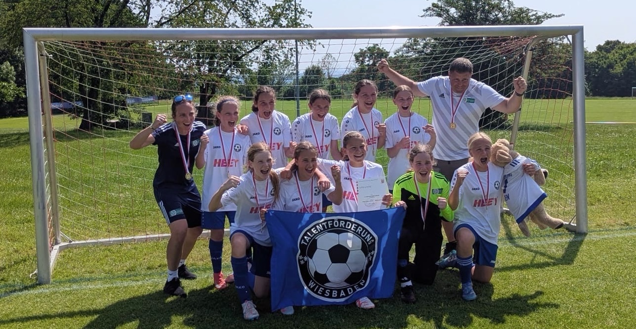 Die Mannschaft des WKIII wurde gestellt aus dem Kader, der im letzten Jahr im WKIV das Bundesfinale gewann. Zweifelsohne eine eingespielte und erfolgreiche Truppe, die allerdings im WKIII als Außenseiter antrat – hatte man doch keine Spielerin des alten Jahrgangs in den eigenen Reihen. Unbeschwert und spielerisch stark präsentierte sich die Mannschaft in den ersten beiden Gruppenspielen und so stand bereits vor dem letzten Gruppenspiel der Einzug ins Halbfinale fest. Hier kam es zum bereits zum Kracherspiel gegen die Carl-von-Weinberg Schule. In einem ansehnlichen und optisch ausgeglichenen Spiel unterlag man letztlich mit 2:0. Rechnete man nach dem Sieg im Halbfinale mit einer Wiederauflage des Gruppenspiels, machte man die Rechnung ohne die Georg-Büchner-Schule aus Darmstadt. Die Mannschaft, die uns bereits im Regionalentscheid im Finale bezwungen hatte, gewann im Elfmeterschießen gegen die Carl-von-Weinberg-Schule. In der Wiederauflage des Finales des Regionalentscheids bissen sich die Mädels der Talentförderung Wiesbaden gegen mauernde und körperlich überlegene Darmstädterinnen trotz hoher Ballbesitzzeiten die Zähne aus. Ein insgesamt chancenarmes Finale musste im Elfmeterschießen entschieden werden. Während zwei unserer drei Schützinnen den Ball im Netz versenkten, konnte unsere Torfrau mit zwei Paraden den Sieg klarmachen. Ein erneuter Sieg im hessischen Landesfinale, der den Einzug ins Bundesfinale nach Berlin bedeutet. Eine fantastische Leistung. Wir freuen uns schon sehr darauf, unser Bundesland erneut vertreten zu dürfen!